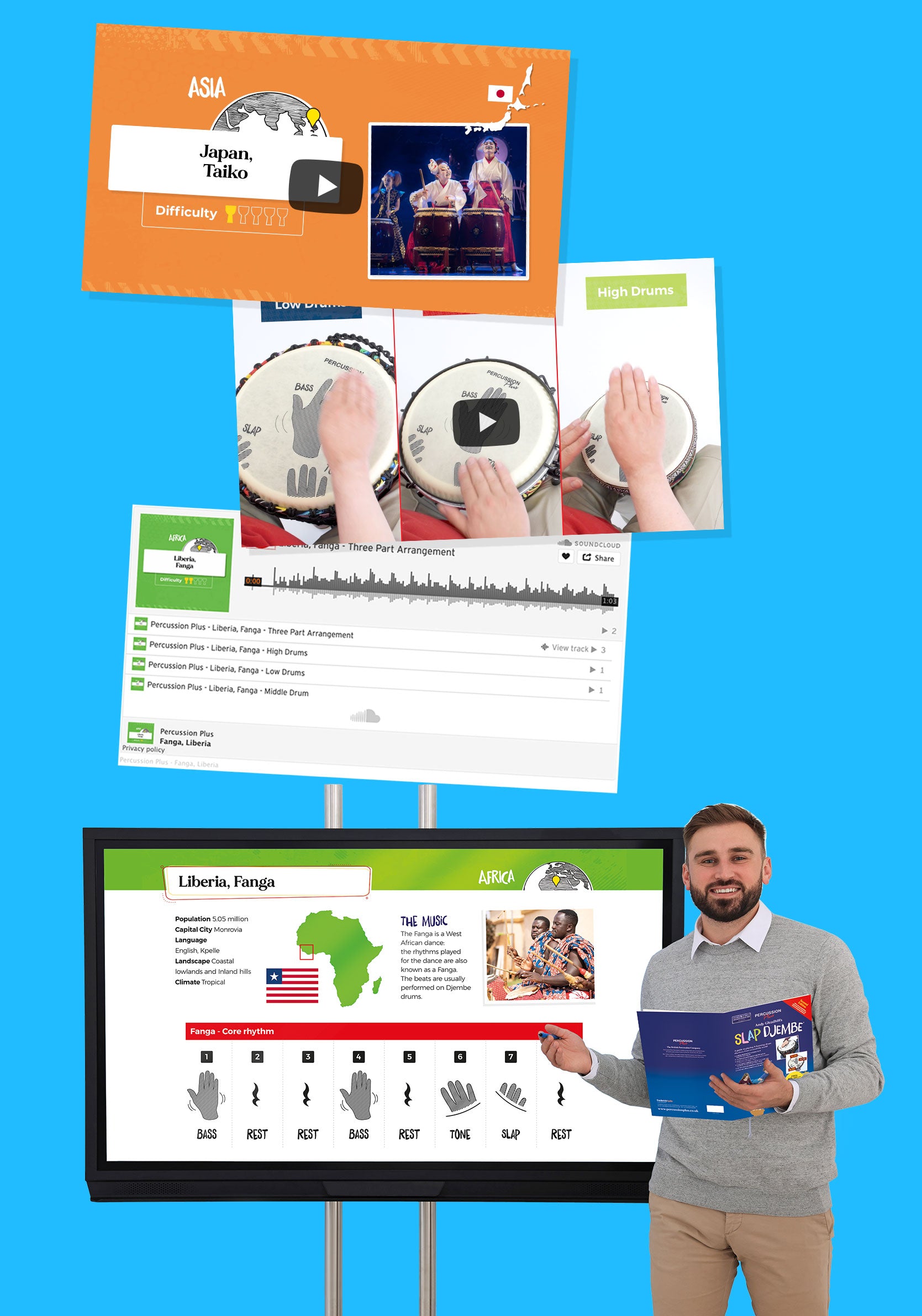 Watch and play along with video performances of every tune, or use the audio clips of each separate part (with metronome intro) as a handy reference when learning and teaching the rhythms. We’ve updated the resources to include all the rhythms, lesson plans and call & response patterns from the book in a format compatible with interactive whiteboards, so now you can teach even more efficiently.