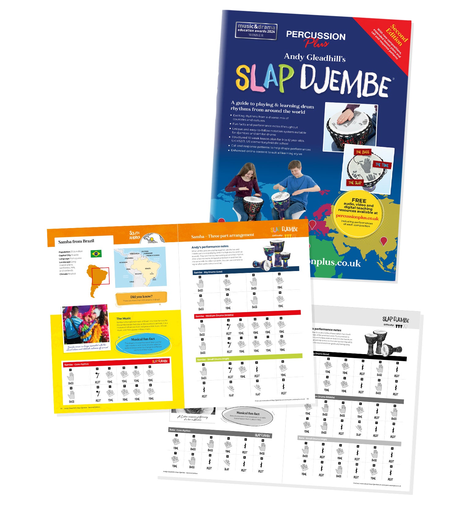 To make the free resources even more accessible, the complete Andy Gleadhill's Slap Djembe second edition is available to download for free as a PDF. Also included are printer friendly PDF spreads of every composition, perfect to use as handouts for the whole class!
